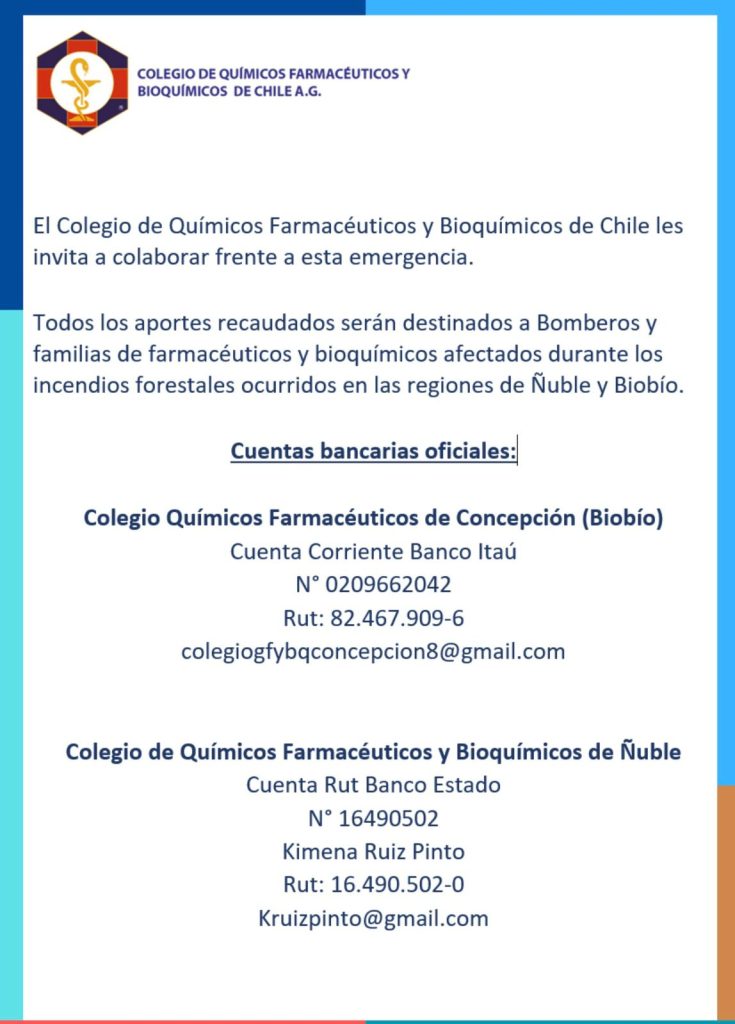 El Colegio Farmacéutico recibe aportes en estas dos cuentas. Lo recibido se canalizará a bomberos y químicos farmacéuticos y bioquímicos de las regiones afectadas.