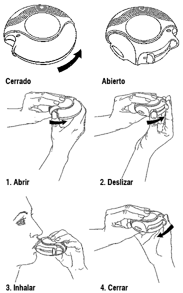 Cómo funciona su Diskus: Al deslizar la palanca de su Diskus, se abre un pequeño orificio en la boquilla y se libera una dosis para que usted pueda inhalarla. Cuando cierra su Diskus, la palanca regresa automáticamente a su posición original, quedando lista para cuando requiera la próxima dosis. El estuche externo protege su Diskus cuando no lo utiliza. 1. Abrir - Cómo usar el Diskus. Para abrir su Diskus, sostenga el estuche externo en una mano y coloque el pulgar de la otra sobre la parte diseñada para este dedo. Empuje su pulgar hacia afuera tanto como sea posible. 2. Deslizar. Sostenga su Diskus con la boquilla apuntando hacia usted. Deslice la palanca hacia afuera tanto como sea posible - hasta que se escuche un clic. Su Diskus ya está listo para usarse. Cada vez que la palanca vuelve a su posición original, queda disponible una nueva dosis para inhalación. Esto se muestra en el dosímetro. No juegue con la palanca, ya que ésta libera dosis que serán desperdiciadas. 3. Inhalar: Antes de comenzar a inhalar la dosis, lea cuidadosamente toda esta sección. Sostenga el dispositivo Diskus lejos de su boca. Exhale tanto como le sea cómodo. Recuerde: nunca exhale dentro de su Diskus. Coloque la boquilla en sus labios. Aspire constante y profundamente - a través del Diskus, no de su nariz. Retire el Diskus de su boca. Mantenga la respiración durante 10 segundos, aproximadamente, o tanto como le sea cómodo. Exhale lentamente. 4. Cerrar. Para cerrar su Diskus, coloque su pulgar en la parte diseñada para el mismo. Deslice esta parte hacia usted tanto como sea posible. Cuando cierra el Diskus, se escucha un clic. La palanca regresa automáticamente a su posición y estado original. Su Diskus ya está listo para usarse nuevamente. Si se le ha indicado tomar dos inhalaciones, deberá cerrar el Diskus y repetir las etapas 1, 2, 3 y 4.