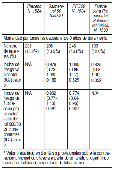Interacciones Medicamentosas: Interacciones medicamentosas y otros tipos de interacciones: Deben evitarse los ß-bloqueadores tanto selectivos como no selectivos, a menos que haya razones imperiosas para su uso. En circunstancias normales, se alcanzan concentraciones plasmáticas bajas de propionato de fluticasona, después de la dosificación por inhalación, debido al amplio metabolismo de primer paso y al alto grado de depuración sistémica, mediados por la isoenzima 3A4 del citocromo P450 en el intestino e hígado. Por tanto, es improbable que se produzcan interacciones medicamentosas, clínicamente significativas, mediadas por el propionato de fluticasona. En un estudio sobre interacciones medicamentosas, realizado en sujetos sanos, se demostró que el ritonavir (un inhibidor altamente potente de la isoenzima 3A4 del citocromo P450) es capaz de aumentar significativamente las concentraciones plasmáticas de propionato de fluticasona, dando como resultado una evidente reducción en las concentraciones séricas de cortisol. Durante su uso posterior a la comercialización, se han producido notificaciones de interacciones medicamentosas clínicamente significativas en pacientes que reciben tratamiento concomitante con propionato de fluticasona intranasal o inhalado y ritonavir, dando como resultado efectos relacionados con la administración de corticoesteroides sistémicos, incluyendo síndrome de Cushing e insuficiencia suprarrenal. Por tanto, se debe evitar el uso concomitante de propionato de fluticasona y ritonavir, a menos que el beneficio potencial para el paciente exceda el riesgo de experimentar efectos secundarios relacionados con la administración de corticoesteroides sistémicos. Los estudios han demostrado que otros agentes inhibidores de la isoenzima 3A4, del citocromo P450, producen aumentos insignificantes (eritromicina) y leves (ketoconazol) en la exposición sistémica al propionato de fluticasona, sin reducciones evidentes en las concentraciones séricas de cortisol. Sin embargo, se recomienda tener cuidado al coadministrar inhibidores potentes de la isoenzima 3A4 del citocromo P450 (por ej., ketoconazol), ya que existe un riesgo de que aumente el grado de exposición sistémica al propionato de fluticasona. La coadministración de ketoconazol y salmeterol produce un aumento significativo en el grado de exposición plasmática al salmeterol (1.4 veces la Cmax y 15 veces el AUC), lo cual podría ocasionar una prolongación en el intervalo QTc (véanse Advertencias y Farmacocinética).