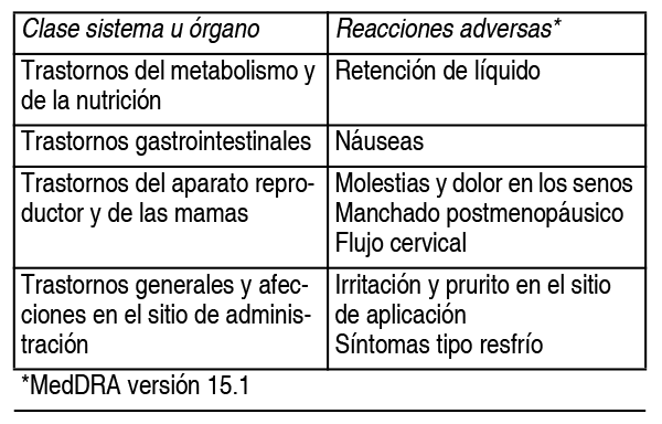 Efectos Colaterales: Clase sistema u órgano: Reacciones adversas*. Trastornos del metabolismo y de la nutrición: Retención de líquido. Trastornos gastrointestinales: Náuseas. Trastornos del aparato reproductor y de las mamas: Molestias y dolor en los senos. Manchado postmenopáusico. Flujo cervical. Trastornos generales y afecciones en el sitio de administración: Irritación y prurito en el sitio de aplicación. Síntomas tipo resfrío. *MedDRA versión 15.1. Estas reacciones adversas usualmente son transitorias, pero también pueden ser indicio de una dosis demasiado elevada. Se han informado otras reacciones adversas asociadas con el tratamiento con estrógeno-progestágeno. Neoplasias estrógeno-dependientes benignas y malignas, por ej., cáncer de endometrio y cáncer de mama. Para más información ver puntos "Contraindicaciones" y "Advertencias y precauciones especiales de uso". Enfermedad de la vesícula biliar. Trastornos cutáneos y subcutáneos, cloasma, eritema multiforme, eritema nodoso, purpura vascular. Posible demencia pasado los 65 años de edad (ver punto Advertencias y precauciones especiales de uso). Riesgo de cáncer de mama: Se informa un riesgo hasta 2 veces mayor de recibir el diagnóstico de cáncer de mama en mujeres que reciben un tratamiento combinado de estrógeno-progestágeno durante más de 5 años. Todo aumento en el riesgo de quienes reciben un tratamiento a base de estrógenos solamente es considerablemente menor que el observado en quienes reciben combinaciones de estrógeno-progestágeno. El nivel de riesgo depende de la duración del tratamiento (consulte la sección Advertencias y precauciones especiales de uso). Se presentan los resultados del ensayo aleatorizado controlado con placebo (el estudio WHI) y del estudio epidemiológico (MWS [Million Women Study (Estudio de un Millón de Mujeres)]) de mayor envergadura. Estudio de un Millón de Mujeres; riesgo adicional estimado de padecer cáncer de mama después del uso durante 5 años.