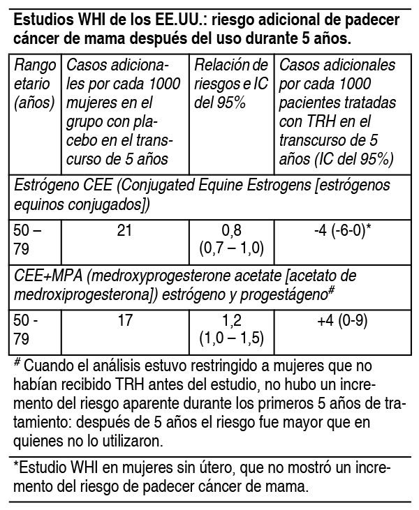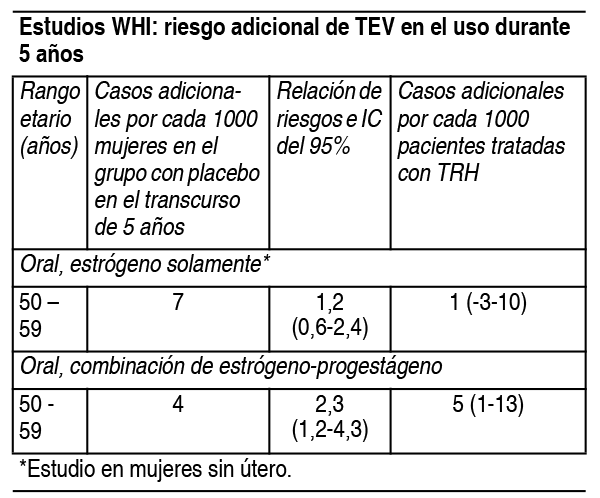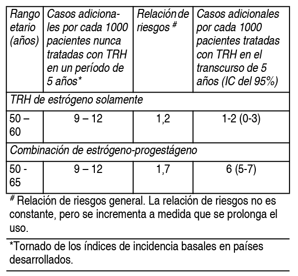 Cáncer de ovario: El uso a largo plazo de TRH con estrógeno solamente y combinado de estrógeno-progestágeno se ha asociado con un riesgo levemente mayor de padecer cáncer de ovario. En el Estudio de un Millón de Mujeres, 5 años de TRH derivaron en 1 caso más por cada 2500 mujeres tratadas. Riesgo de padecer una tromboembolia venosa: La TRH se asocia con un riesgo relativo 1,3-3 veces mayor de tener una tromboembolia venosa (TEV), es decir, una trombosis venosa profunda o una embolia pulmonar. La aparición de un evento de esta naturaleza es más probable durante el primer año de uso de la TRH (consulte la sección Advertencias y precauciones especiales de uso). Se presentan los resultados de los estudios WHI:
