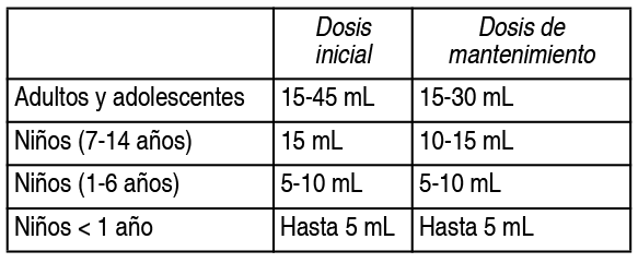 Dosificación en encefalopatía hepática portosistémica (sólo en adultos): Administración oral: La dosis inicial será de 30 a 45 ml administrados de 3 a 4 veces al día. La dosis de mantenimiento se ajustará con el fin de conseguir 2 ó 3 deposiciones blandas al día. Administración rectal: En casos agudos (impedimento por coma o estado de coma) lactulosa puede ser administrada como edema de retención (300 ml de lactulosa /700 ml de agua). El enema debe retenerse por 30-60 minutos; el procedimiento debe repetirse cada 4-6 horas hasta que se pueda administrar por vía oral.
