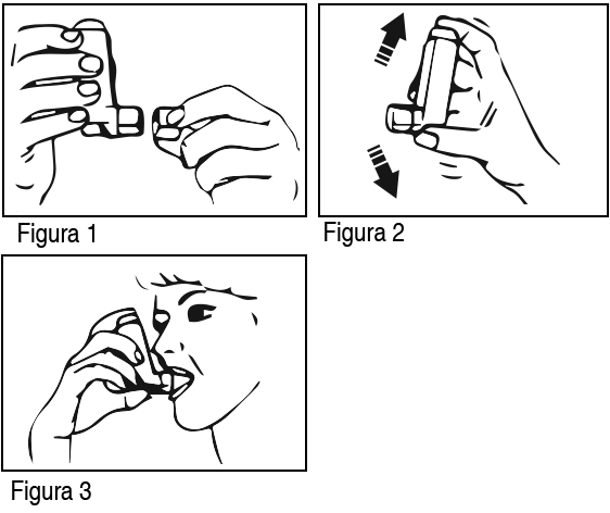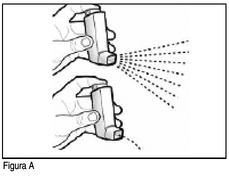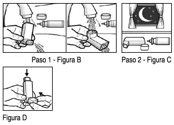 Disparo de prueba: Como todos los aerosoles de uso médico, es una sabia precaución hacer un disparo de prueba al aire antes de utilizarlo por primera vez, y en cada ocasión en que el aerosol permanezca sin uso durante 1 semana o más. Higiene del adaptador: Es muy importante la higiene del adaptador bucal. Si no se realiza una higiene adecuada el aerosol puede no emitir dosis. Cuando la medicación que sale es poca o nula (ver figura A), es porque el aerosol se ha tapado, entonces debe lavarse el adaptador como se indica en los pasos 1 y 2. Lave semanalmente el adaptador con agua tibia y séquelo bien. No trate de desobstruir con objetos puntiagudos tales como un alfiler. Siga las siguientes instrucciones: Paso 1. Quite el bidón de aerosol y la tapa del adaptador. Lave de arriba hacia abajo, de un lado y del otro del adaptador, con agua tibia durante 30 segundos al menos 1 vez a la semana (ver figura B). No sumergir el bidón en el agua. Paso 2. Sacudir y dejar secar al aire libre, por ejemplo durante la noche o descanso (ver figura C). La acumulación de medicamento se produce con más frecuencia si el adaptador no se seca al aire libre. Una vez seco, colocar el bidón y la tapa (ver figura D). Si necesitara usar el aerosol antes de que éste se seque completamente al aire, sacudir el exceso de agua, colocar el bidón y pulsar el aerosol 2 veces al aire lejos del rostro, a fines de arrastrar el resto de agua. Administrar la dosis y luego lavar nuevamente y secar según los pasos 1 y 2.