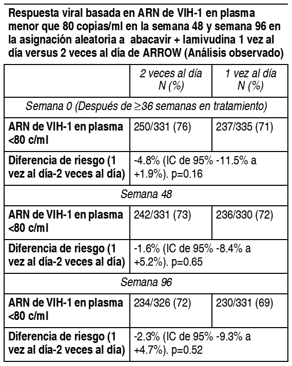 Se demostró que el grupo de dosificación de abacavir/lamivudina 1 vez al día no era inferior al grupo de 2 veces al día de conformidad con el margen de no inferioridad previamente especificado de -12%, para el criterio de valoración principal de <80 c/ml en la Semana 48 así como en la semana 96 (criterio de valoración secundario) y todos los demás límites evaluados (<200 c/ml, <400 c/ml, <1000 c/ml), los cuales se ubicaron claramente dentro de este margen de no inferioridad. Las pruebas de análisis de subgrupo en cuanto a heterogeneidad de 1 versus 2 veces al día no demostraron efecto significativo del sexo, la edad o la carga viral en la asignación aleatoria. Las conclusiones respaldaron la no inferioridad a pesar del método de análisis. El Registro Antirretroviral del Embarazo ha recibido reportes de más de 11.000 exposiciones a la lamivudina durante el embarazo que resultaron en un nacimiento vivo. Estos consisten en más de 4.200 exposiciones durante el primer trimestre, más de 6.900 exposiciones durante el segundo/tercer trimestre e incluyeron 135 y 198 defectos de nacimiento, respectivamente. La prevalencia (95% CI) de defectos en el primer trimestre fue de 3.2% (2.6; 3.7%) y en el segundo/tercer trimestre, 2.8% (2.4; 3.2%). Entre mujeres embarazadas en la población de referencia, la tasa prevalente de defectos de nacimiento es 2.7%. El Registro Antirretroviral del Embarazo no muestra un mayor riesgo de defectos de nacimiento importantes para la lamivudina en comparación con la tasa prevalente.