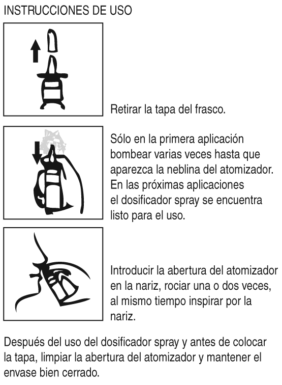 Advertencias: No use este producto por más de 1 semana sin control médico. No usar en niños menores de 6 años. Al igual que los descongestivos nasales, se debe consultar al médico para tratamientos prolongados, mayores de 1 semana, pues su uso prolongado e indiscriminado provoca rinitis vasomotora de difícil tratamiento. Un período sin tratamiento de varios días debe preceder a cualquier uso repetido. El uso permanente de agentes rinológicos descongestionantes puede atenuar su efecto. El abuso de agentes rinológicos locales puede causar atrofia de la mucosa e hiperemia reactiva con rinitis medicamentosa. El uso prolongado y la dosificación excesiva deben evitarse. La eficacia de los agentes descongestionantes rinológicos puede disminuir (taquifilaxia) con el uso prolongado y la dosificación excesiva. Esto puede llevar a utilizar dosis más altas, utilizarlo con mayor frecuencia, lo cual puede dar como resultado el uso permanente. Si ocurre un uso prolongado o dosificación excesiva, el tratamiento debe suspenderse de inmediato.