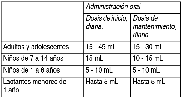 Dosificación en pre-coma y coma hepático (sólo para adultos): Administración oral: Dosis de inicio: 3 a 4 veces al día 30-45 ml. Esta dosis puede ser ajustada a la dosis de mantenimiento para conseguir 2 a 3 heces blandas al día. Administración rectal: En casos agudos (impedimento por coma o estado de coma) lactulosa puede ser administrada como edema de retención (300 ml de lactulosa/700 ml de agua). El enema debe retenerse por 30-60 minutos; el procedimiento debe repetirse cada 4-6 horas hasta que se pueda administrar por vía oral.