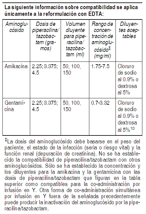 Posología: Piperacilina/tazobactam debe administrarse por infusión endovenosa lenta (por ejemplo, durante 20-30 minutos) o por inyección endovenosa lenta (durante por lo menos 3-5 minutos). Duración del tratamiento: La duración del tratamiento se basará en la gravedad de la infección y en la evolución clínica y bacteriológica del paciente. Adultos y niños a partir de 12 años: En general, la dosis total diaria recomendada es de 12 g de piperacilina/1.5 g de tazobactam administrados en dosis divididas cada 6 u 8 horas. En infecciones graves, podrán administrarse dosis de hasta 18 g de piperacilina/2.25 g de tazobactam por día en dosis divididas. Neutropenia pediátrica:Pacientes neutropénicos febriles en combinación con un aminoglucósido: En niños con función renal normal y menos de 50 kg de peso, la dosis deberá ajustarse a 80 mg de piperacilina/10 mg de tazobactam por kg y se administrará cada 6 horas en combinación con la dosis adecuada de un aminoglucósido. En niños de más de 50 kg de peso, se administrará la posología para adultos en combinación con la dosis adecuada de un aminoglucósido. Infecciones intra abdominales pediátricas: En niños de 2 a 12 años de edad, de hasta 40 kg de peso y con función renal normal, la dosis recomendada es de 100 mg de piperacilina/12.5 mg de tazobactam por kg de peso corporal cada 8 horas. En niños de 2 a 12 años de edad, de más de 40 kg de peso y con función renal normal, se seguirán las recomendaciones posológicas para adultos. Se recomienda un período mínimo de 5 días y máximo de 14 días de tratamiento, considerando que la administración de la dosis deberá continuar durante por lo menos 48 horas después de la resolución de los signos y síntomas clínicos. Pacientes con insuficiencia renal: En pacientes con insuficiencia renal o sometidos a hemodiálisis, deberá ajustarse la dosis endovenosa y los intervalos de administración en relación al grado de insuficiencia renal. Pacientes con insuficiencia hepática: No es necesario ajustar la dosis de piperacilina/tazobactam en pacientes con disfunción hepática. Coadministración de piperacilina/tazobactam con aminoglucósidos: Debido a la inactivación in vitro del aminoglucósido por los antibióticos betalactámicos, se recomienda administrar piperacilina/tazobactam y el aminoglucósido por separado. La piperacilina/tazobactam debe reconstituirse y diluirse por separado cuando se indique tratamiento concomitante con aminoglucósidos. En aquellas circunstancias en que se prefiera la coadministración, la reformulación de piperacilina/tazobactam que contiene EDTA suministrada en frascos-ampolla es compatible para la coadministración simultánea por infusión en Y únicamente con los siguientes aminoglucósidos y bajo las siguientes condiciones: La siguiente información sobre compatibilidad se aplica únicamente a la reformulación con EDTA: