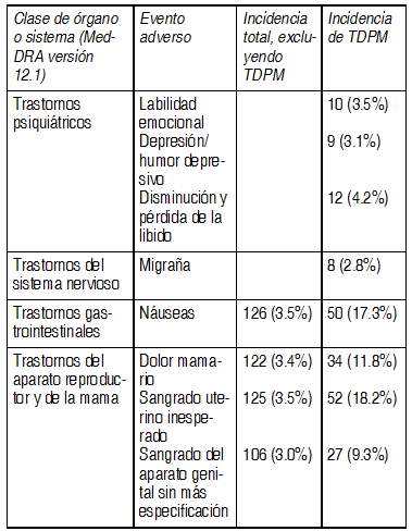 Observaciones:Apéndice 1: Resumen del perfil de seguridad: Los eventos adversos reportados con más frecuencia con Yaz, cuando se utiliza como anticonceptivo oral o en el tratamiento del acné vulgar moderado en mujeres que eligen utilizar anticoncepción oral, son náusea, dolor mamario, sangrado uterino inesperado y sangrado del aparato genital sin más especificación. Se presentaron en ≥ 3 % de las usuarias. Los eventos adversos más frecuentemente reportados con Yaz, cuando se utiliza para el tratamiento del TDPM en mujeres que eligen usar anticoncepción oral, son náusea, dolor mamario y sangrado uterino inesperado. Se presentaron en > 10% de las usuarias. Los eventos adversos serios son tromboembolismo arterial y venoso. Resumen tabulado de eventos adversos: Las frecuencias de EA reportados en ensayos clínicos con Yaz y Yaz Plus como anticonceptivos orales y Yaz en el tratamiento del acné vulgar moderado en mujeres que eligen utilizar anticoncepción oral (N=3565), así como Yaz en el tratamiento de los síntomas del TDPM en mujeres que eligen utilizar anticoncepción oral (N= 289) se resumen en la tabla siguiente. Los eventos adversos que se presentaron en al menos el 2% de las usuarias en ensayos clínicos con Yaz se exponen en la tabla siguiente: