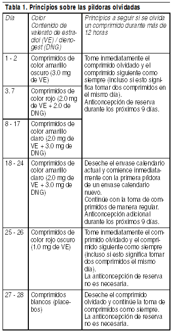 Composición: 26 comprimidos recubiertos que contienen hormonas, en el siguiente orden: 2 comprimidos de color amarillo oscuro, cada uno tiene 3 mg de Valerato de Estradiol. 5 comprimidos de color rojo intermedio, cada uno con 2 mg de Valerato de Estradiol y 2 mg de Dienogest. 17 comprimidos de color amarillo claro, cada uno con 2 mg de Valerato de Estradiol y 3 mg de Dienogest. 2 comprimidos de color rojo oscuro, cada uno con 1 mg de Valerato de Estradiol. Excipientes: Lactosa 46, 45, 48 ó 44 mg, respectivamente. 2 comprimidos recubiertos de color blanco sin hormonas. Excipientes: Lactosa 50 mg.